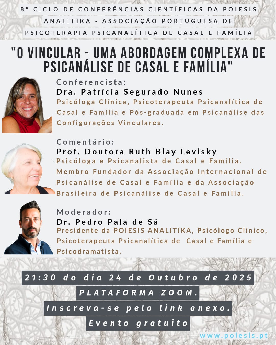 A formação em Psicoterapia Psicanalítica de Casal e Família da Poiesis cumpre com os requisitos para a obtenção da Especialidade Avançada em Psicoterapia da Ordem dos Psicólogos Portugueses.